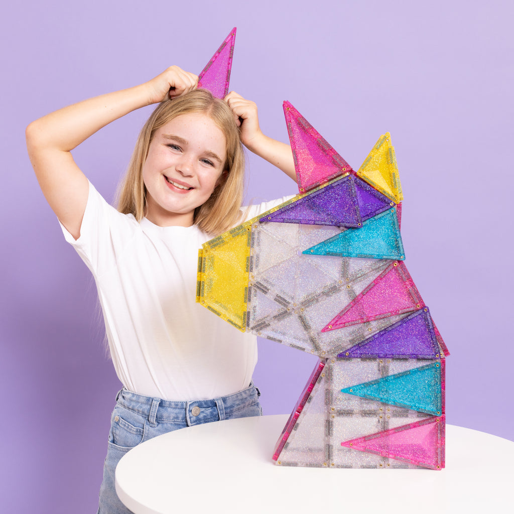 Designed for the unicorn lovers, fantasy dreamers and creative explorers, this pack is filled with delightful play possibilities. Featuring a stunning combination of glitter magnetic tiles in dazzling clear and vibrant bright colours of pink, yellow, teal and purple, plus a thoughtful selection of shapes in squares, hexagons, rectangles, triangles and trapezoids to bring your sparkly unicorn creation to life!